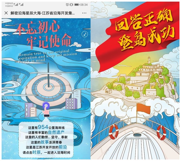 H5通過游戲、視頻、畫冊(cè)等形式,以解密時(shí)辰密碼為概念,分辰、巳、午、未、申、酉時(shí)間段,分別從登開山島悟初心、追尋趙亞夫足跡、解綠色發(fā)展之題、覽沿海美麗風(fēng)光、聽沿海青年心聲、品江蘇沿海美食角度展現(xiàn)江蘇沿海人的奮斗故事與初心使命。