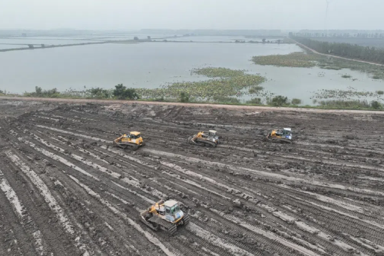 金湖縣寶應湖退圩還湖項目排泥場1#地塊土方平整施工現(xiàn)場