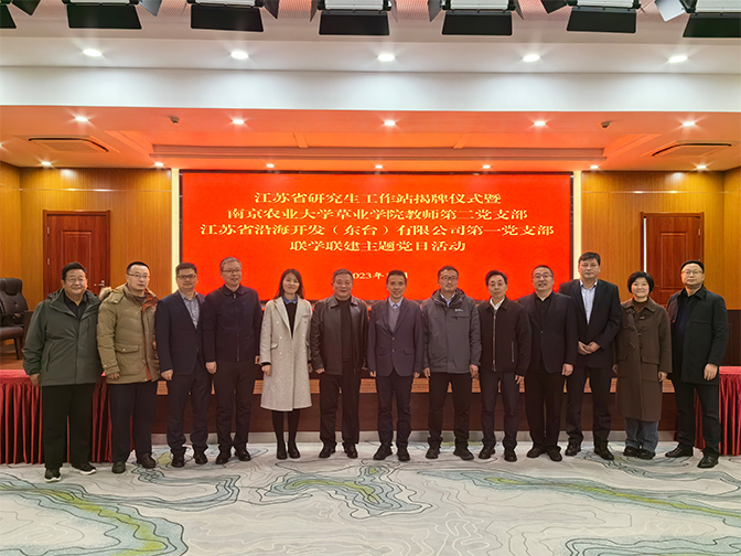 會上,南京農(nóng)業(yè)大學(xué)研究生院學(xué)位辦副主任朱中超宣讀關(guān)于批準(zhǔn)東臺公司江蘇省研究生工作站建設(shè)的決定,研究生工作站站長匯報(bào)了關(guān)于工作站的籌建、運(yùn)行及未來規(guī)劃情況。東臺公司條子泥研究生工作站于今年9月份正式獲得省教育廳和科技廳的聯(lián)合批準(zhǔn),工作站實(shí)行校企雙站長模式,工作站以學(xué)科交叉研究實(shí)踐為特點(diǎn)引進(jìn)專家10位,專業(yè)涉及草業(yè)科學(xué)、作物栽培學(xué)、土壤微生物學(xué)、漁農(nóng)復(fù)合等多個(gè)專業(yè)。隨后,東臺公司第一黨支部與南京農(nóng)業(yè)大學(xué)草業(yè)學(xué)院教師第二黨支部簽署了支部結(jié)對共建協(xié)議,共建雙方以黨建為引領(lǐng),建立健全高校和企業(yè)的常態(tài)化聯(lián)絡(luò)機(jī)制,促進(jìn)企業(yè)導(dǎo)師和高校導(dǎo)師的溝通交流,推動校企黨建與科研生產(chǎn)融合發(fā)展。