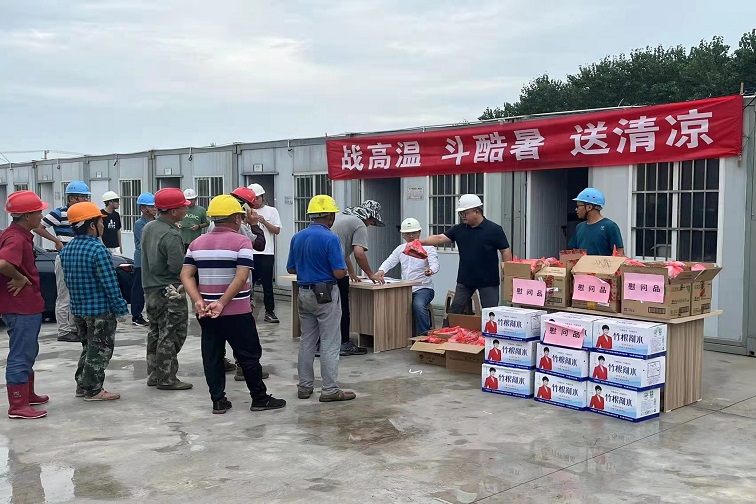 為做好高溫條件下項目建設(shè)人員的防暑降溫工作,切實辦好民生實事,保障一線施工人員的身體健康,8月16日下午,鶴豐公司黨支部聯(lián)合建管中心黨支部開展“戰(zhàn)高溫,斗酷暑,送清涼”慰問活動,為一線工人送去防暑用品和飲用水等,用實際行動撐起解暑降溫的“遮陽傘”,為奮戰(zhàn)在一線的職工送去了絲絲涼意和黨支部的誠摯關(guān)懷。