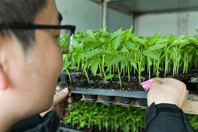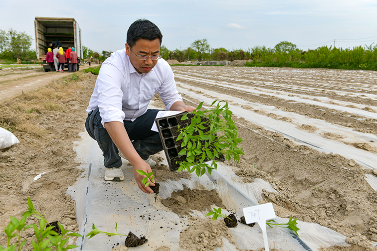 在距離劍豐試驗田70余公里的南通如東縣,省沿海集團(tuán)所屬凌洋公司“揭榜掛帥”示范基地,數(shù)百個品種的辣椒苗整齊堆放在田埂上,爭先往外冒著綠芽兒,一派勃勃生機(jī)。江蘇省農(nóng)業(yè)院蔬菜研究所副所長刁衛(wèi)平穿梭其間,不時俯身插入示意牌,等待苗株分類移栽。
