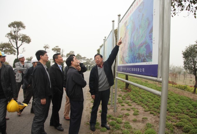 梁學(xué)忠董事長(右一)介紹條子泥I期工程施工現(xiàn)場平面布置圖