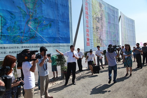 2012年7月28日上午,條子泥匡圍項(xiàng)目工地彩旗招展,氣球飄揚(yáng),省沿海開(kāi)發(fā)推進(jìn)會(huì)的代表冒著高溫酷暑蒞臨現(xiàn)場(chǎng)參觀考察。參加這次活動(dòng)的有:在寧省沿海地區(qū)發(fā)展領(lǐng)導(dǎo)小組成員單位主要負(fù)責(zé)人;南通、連云港、鹽城市市委書(shū)記、市長(zhǎng)、常務(wù)副市長(zhǎng),市發(fā)改委、經(jīng)信委、沿海辦、海洋與漁業(yè)局主要負(fù)責(zé)人,所轄縣(市、區(qū))黨委、政府主要負(fù)責(zé)同志;其他省轄市及所轄縣(市、區(qū))政府主要負(fù)責(zé)同志;全省國(guó)家級(jí)和沿海三市省級(jí)開(kāi)發(fā)區(qū)主要負(fù)責(zé)同志,共約250人。
