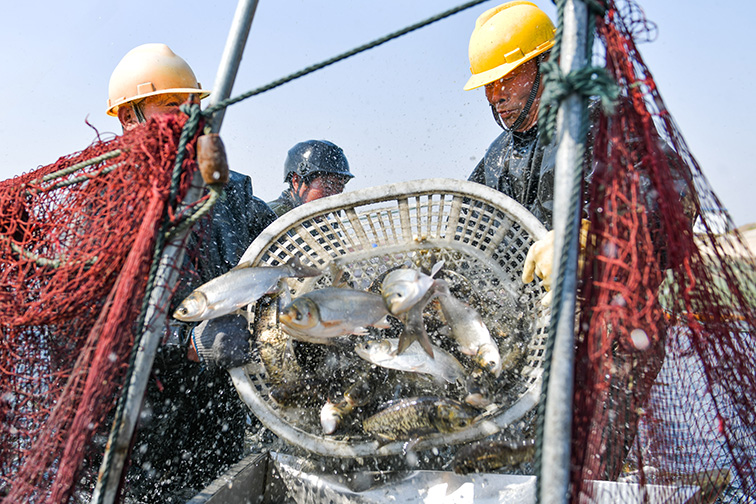 劃點(diǎn)圍網(wǎng)、分揀成框、移運(yùn)裝車,省沿海集團(tuán)東臺(tái)公司自營(yíng)養(yǎng)殖區(qū)里,捕撈工作正有條不紊地進(jìn)行。制氧機(jī)翻起的浪花向周圍蕩漾開去,襯著工人們整齊有力的吆喝聲,滿眼的熱鬧之意?;畋膩y跳的鮰魚和花白鰱不停地?fù)淅庵舶停诟鞯拦ば蜷g快速流轉(zhuǎn)著。停在路邊的運(yùn)輸車也早已蓄勢(shì)待發(fā),準(zhǔn)備好載著最鮮美的春味,向市場(chǎng)駛?cè)ァ?/span>