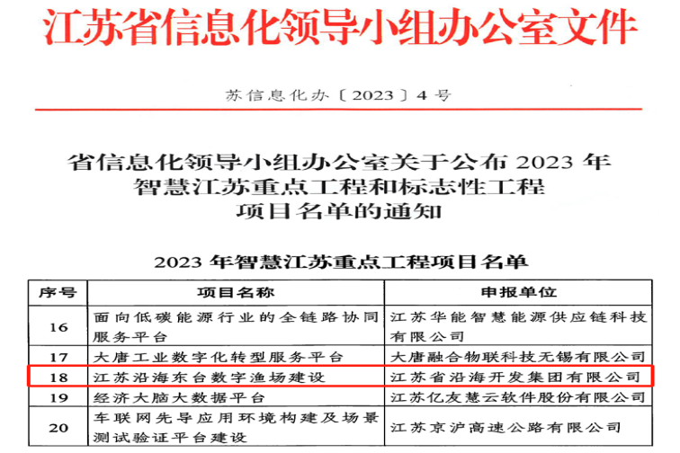 近日,江蘇省信息化領(lǐng)導(dǎo)小組辦公室公布了2023年智慧江蘇重點(diǎn)工程項(xiàng)目名單,江蘇省沿海開(kāi)發(fā)集團(tuán)有限公司的“江蘇沿海東臺(tái)數(shù)字漁場(chǎng)建設(shè)”項(xiàng)目經(jīng)過(guò)初審?fù)扑]、形式審查、專(zhuān)家評(píng)審、綜合會(huì)審等環(huán)節(jié)成功入選,成為省級(jí)數(shù)字化示范工程的重要一員。