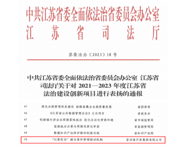 近日,江蘇省委全面依法治省委員會辦公室、省司法廳聯合對2021-2023年度江蘇省法治建設創(chuàng)新項目進行通報表揚。經過申報、初審、專家評審、實地考察認證、公示等程序,集團《“以案促治”健全案件管理聯動機制》成功入選,成為唯一一家獲此獎項的省屬企業(yè),與省國資委同獲殊榮。