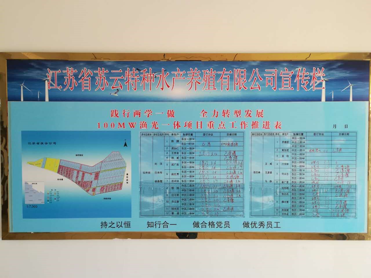 根據(jù)任務(wù)目標,蘇云公司要在3月31日前完成土地移交,涉及23戶養(yǎng)殖戶,37口魚塘,2700余畝水面。時間緊、任務(wù)重、壓力大,清障工作迫在眉睫。蘇云公司從去年12月開始精心籌劃,按照抓緊、從早原則,自加壓力,連夜制定清障方案。在清障中,充分發(fā)揮黨支部戰(zhàn)斗堡壘作用和黨員先鋒模范作用,由黨員領(lǐng)導干部牽頭,職工黨員包保塘口,分工有序,逐步推進。根據(jù)清障方案,設(shè)定突破、進度、攻堅三個時間節(jié)點,以此鼓勵養(yǎng)殖戶交塘。制作張貼“踐行兩學一做、全力轉(zhuǎn)型發(fā)展 100MW漁光一體項目重點工作推進表”,實時顯示清障進度,提醒、督促黨員集中力量,全力推進工作進展。截至目前,已移交的2000畝魚塘均可正常施工,剩余部分主要養(yǎng)殖夏花魚,確保在6月底前實現(xiàn)移交。目前,3500畝“漁光一體”項目土地移交取得階段性成果。