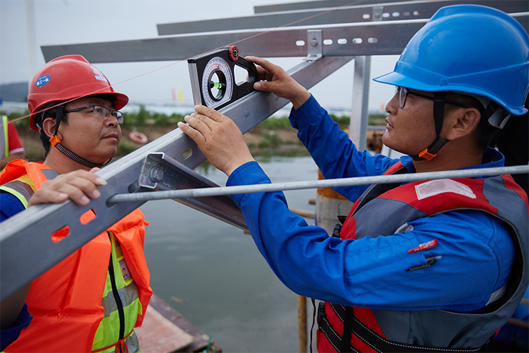 灌云洋橋光伏發(fā)電區(qū)水域面積3300畝,按照項(xiàng)目規(guī)劃設(shè)計(jì),整個(gè)區(qū)域?qū)仢M由37萬片540瓦的雙面雙玻光伏組件組成的發(fā)電矩陣。當(dāng)前正值夏季雷雨高發(fā)時(shí)期,為避免降雨對(duì)施工進(jìn)度和工程質(zhì)量的影響,組件安裝將全部采用水面作業(yè)方式。